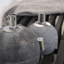 Deze bolvormige olielamp is perfect voor lange zomeravonden in de tuin. De olielamp is voorzien van een roestvast stalen oliecontainer, een glasvezellont en een kap om de vlam te doven.