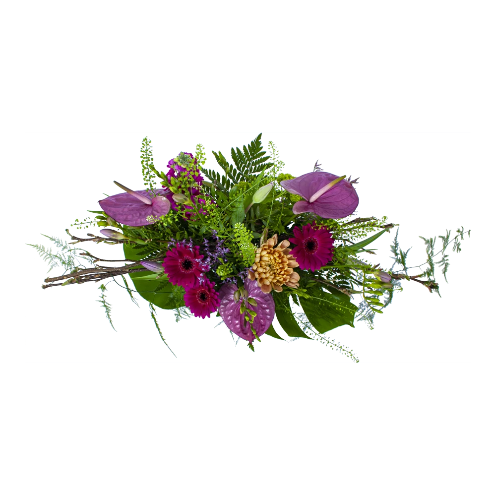 De combinatie van de kleurrijke paarse bloemen geven het bladboeket een prachtige en chique uitstaling. Dit bladboeket creëert een gezellige sfeer in elke ruimte. Bovendien geschikt voor verschillende gelegenheden. Feliciteer, bedankt of verstuur zomaar dit prachtige handgebonden boeket en verras de ontvanger! * Exclusief accessoires en vaas