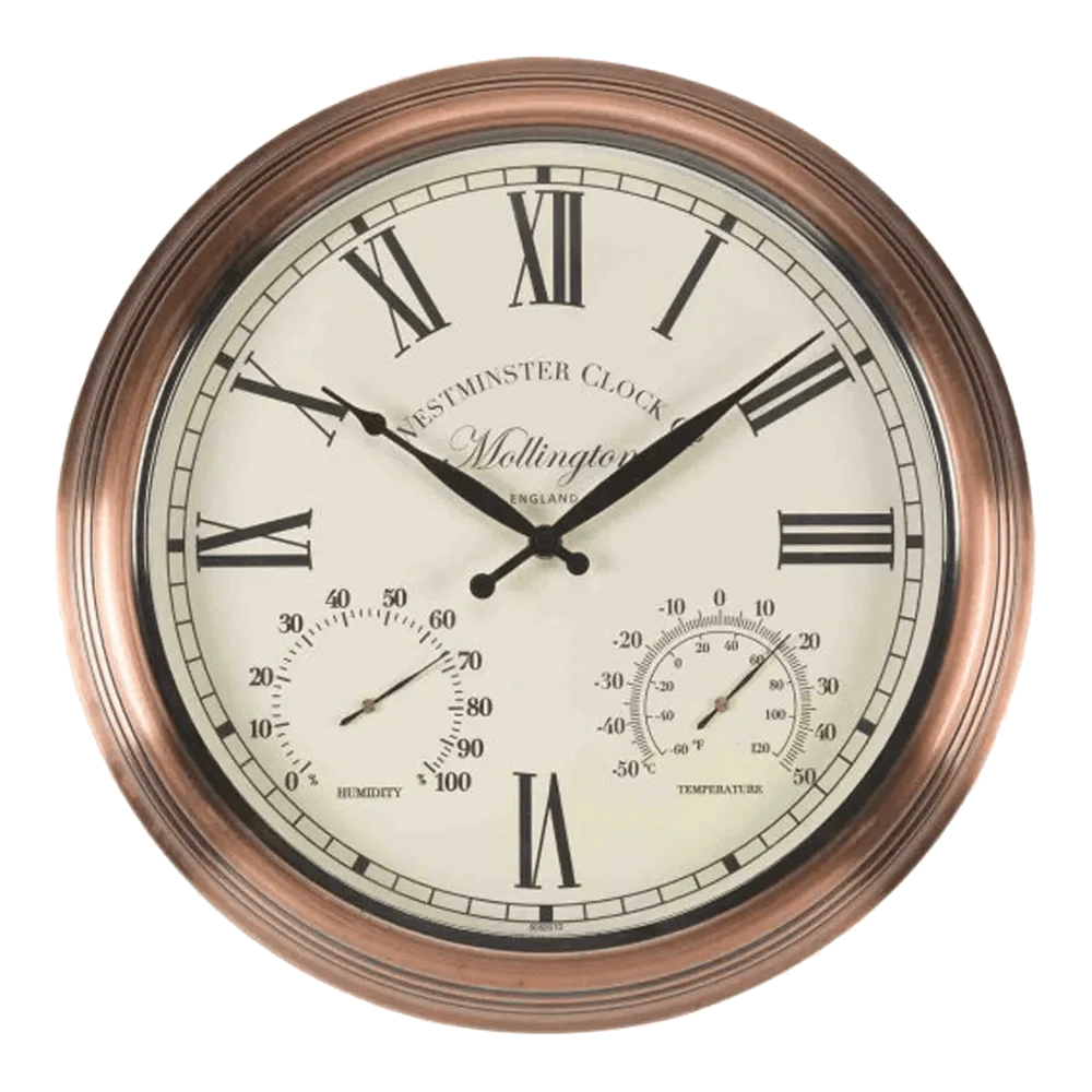 Klassieke klok met bronskleurige rand. Met romeinse cijfers. 3in1 inclusief hygro- en thermometer.Heeft 1 AA batterij nodig om te werken. 2 jaar garantie.