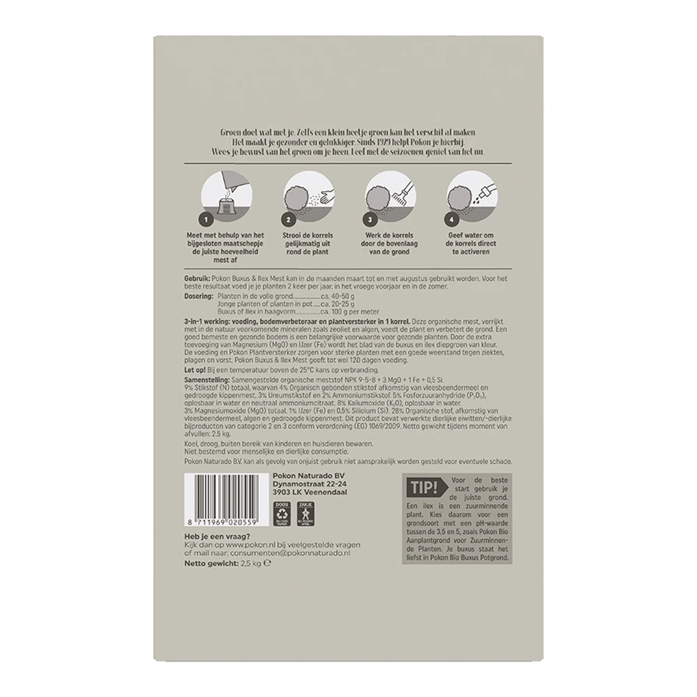 | Dosis | Planten in volle grond: ca. 40-50g. Jonge planten of planten in pot: ca. 20-25g. Buxus of Ilex in haagvorm: ca. 100g per meter. |