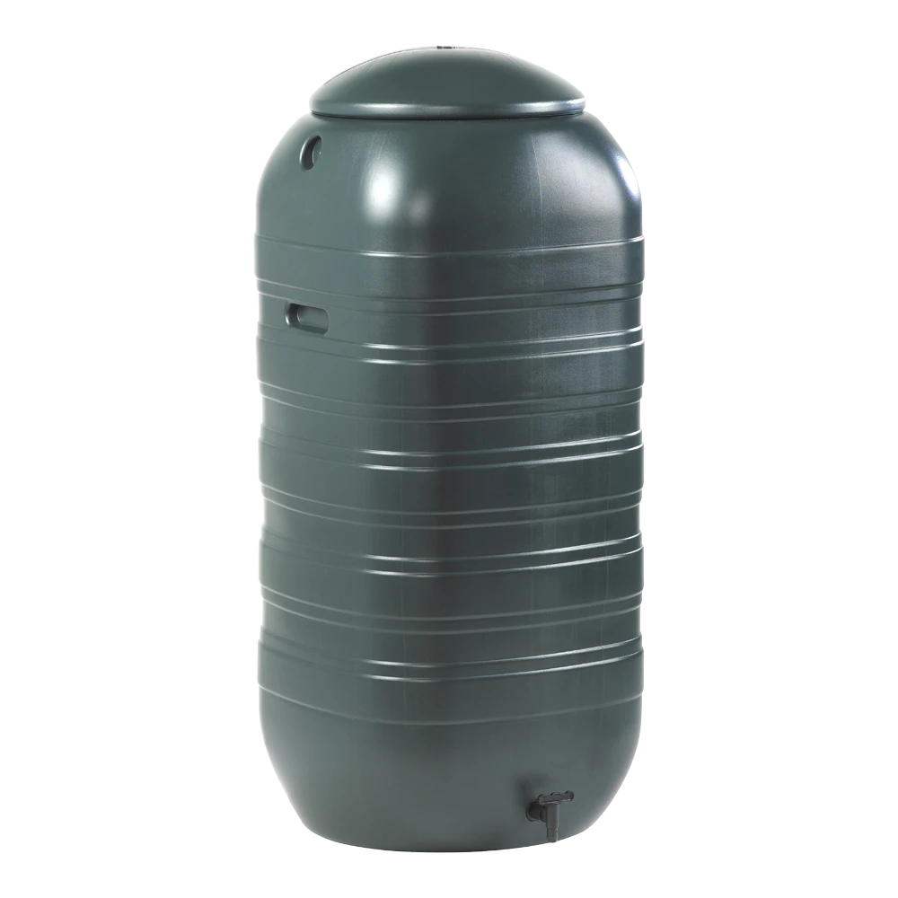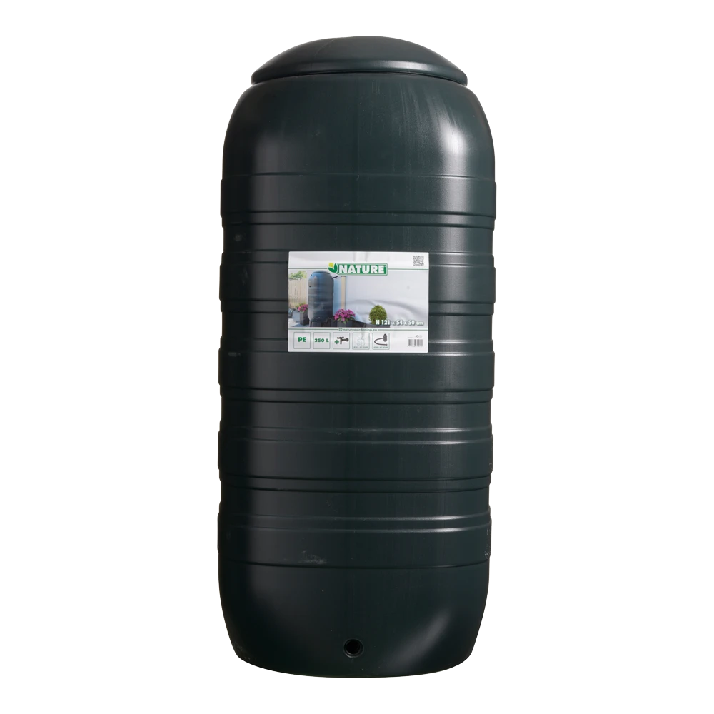 Kunststof regenton 250 L muurmodel (‘slimline’). Deze regenton is gemaakt van uv-bestendig, groen polyethyleen en heeft een kraan om makkelijk emmers en gieters te kunnen vullen. Afmeting: H 121 cm x 54 x 50 cm, inhoud: 250 L.