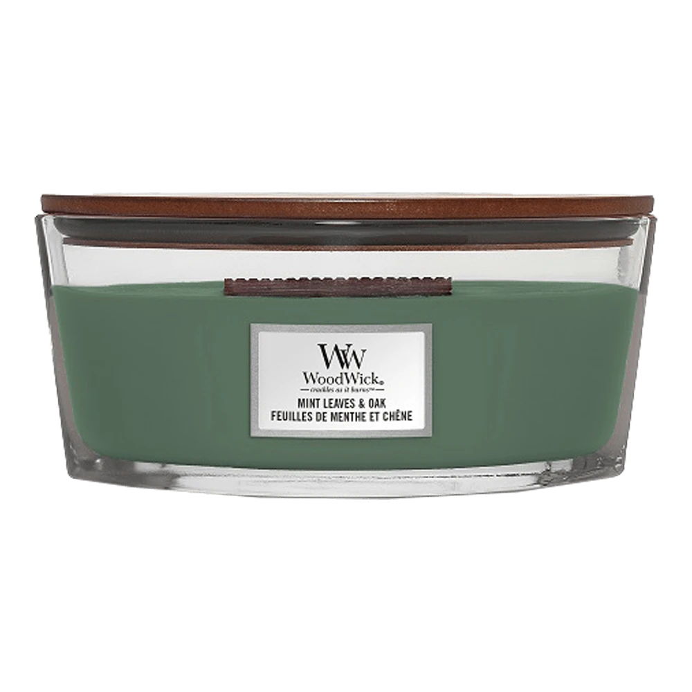 Details van de Woodwick Mint Leaves & Oak Ellipse Geurkaars: